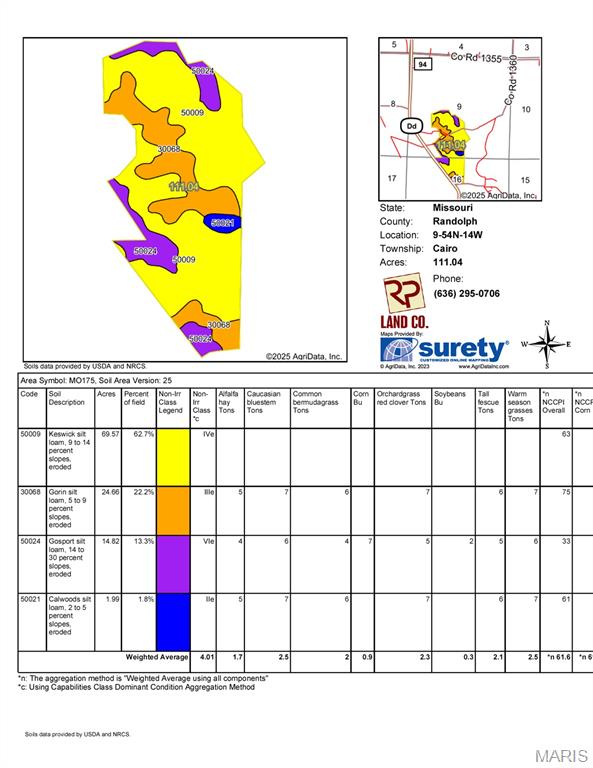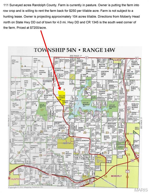 111 Surveyed acres Randolph County. Farm is currently in pasture. Owner is putting the farm into row crop and is willing to rent the farm back for $250 per tillable acre. Owner is projecting approximately 104 acres to be tillable. Farm is not subject to a hunting lease. Priced at $7,200 per acre