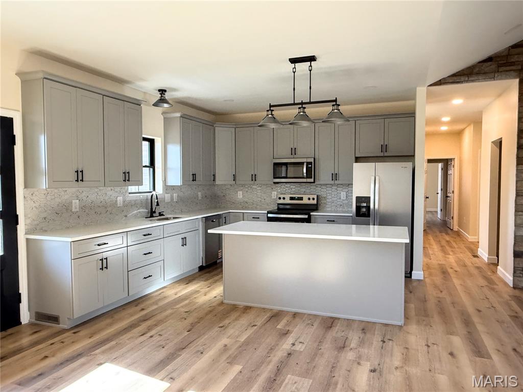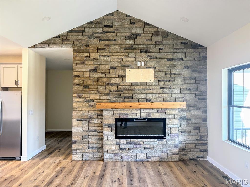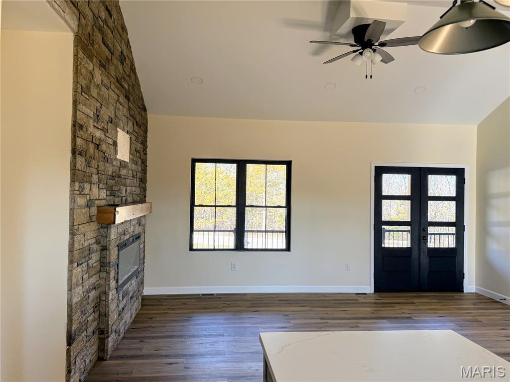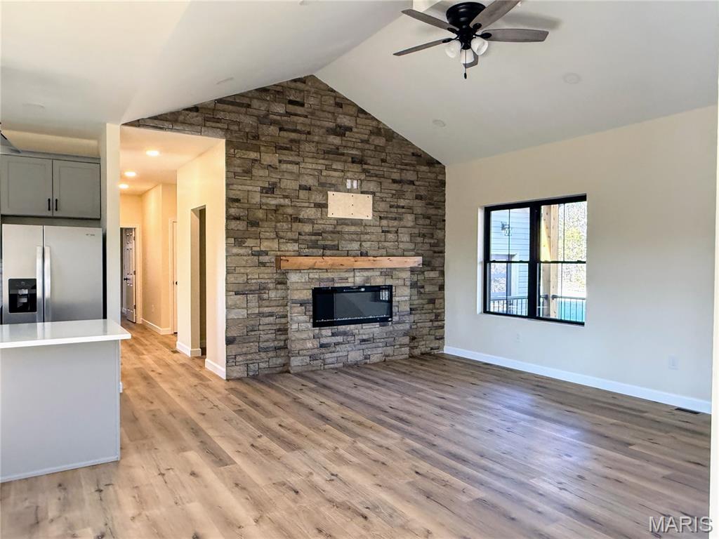 Discover exceptional new construction on 2.55 acres in Terre Du Lac! This nearly completed 4-bedroom, 3.5-bath home blends modern comfort with peaceful acreage living. The main level features bright, open spaces centered around a stunning stone electric fireplace, creating a warm and inviting gathering space. Quality shines throughout, including stamped concrete driveway, sidewalks, porches, and patios that add curb appeal and long-lasting durability. The partially finished walkout basement offers incredible versatility with its own second kitchen, additional bedroom, full bathroom, and a storm shelter/storage room with electric—perfect for safety, hobbies, or extra storage. With abundant windows and open space, the lower level lives like a private suite. A 3-car attached garage, dedicated workshop, and fenced backyard provide all the functionality and outdoor enjoyment you need. Located in the desirable Terre Du Lac community with access to lakes, golf, and amenities, this brand-new home delivers both tranquility and convenience. A rare opportunity to own a beautifully finished walkout home on acreage—don’t miss your chance to make it yours!