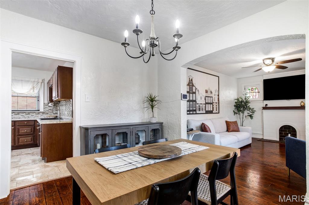 Back on the market with no fault due to seller! Charming bungalow with a beautifully landscaped yard on a corner lot! This home is adorned with features throughout starting with an all-brick exterior and welcoming front porch. Enter into the spacious living room with a decorative fireplace, stained glass windows, large front windows boasting tons of natural light and gorgeous wood flooring throughout. Just past the living room is the separate dining room with more wonderful details including a chandelier, nook area and stairs leading to the upper level. The kitchen is complete with tons of beautiful custom wood cabinets, tiled backsplash, large sink with updated faucet and stainless-steel appliances. French doors just off the kitchen lead to an adorable breakfast room with a custom built in beverage bar with beverage cooler and open shelving. There are 2 large bedrooms with nice-sized closets on the main level of this home as well as a large bathroom with a gorgeous, tiled shower, vanity with plenty of storage and more of those beautiful stained glass windows. Upstairs you will find the spacious master bedroom with a huge walk-in closet and extra storage space. The basement is unfinished with your laundry area and plenty of space for more storage. Step outside to a private back yard with a 6’ fence and large patio area perfect to relax on a nice day or entertain your guests. There is a one car detached garage that is a great added bonus. This charming historic home will not last long, be sure to make your appointment today to come see everything it has to offer!