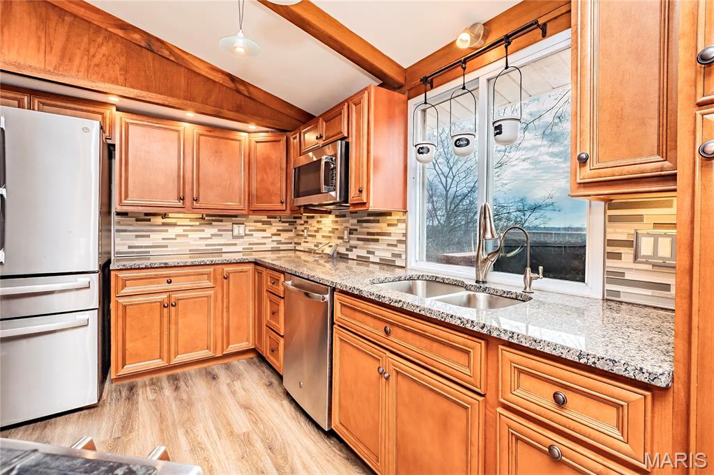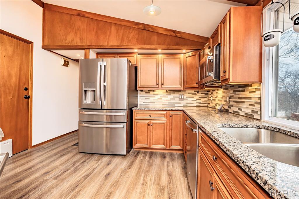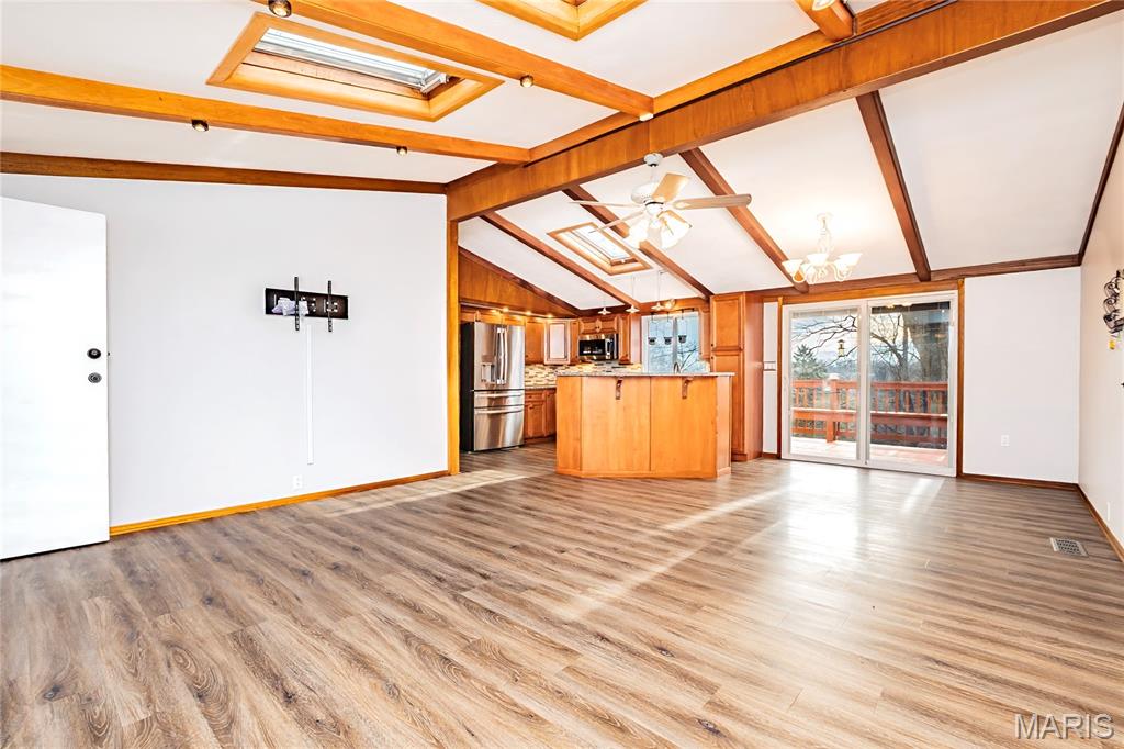 Beautifully maintained ranch home nestled in a sought-after lake community in Fenton, Missouri! This 3-bedroom, 2 full bath home offers comfortable main-level living with thoughtful updates throughout. The updated kitchen features granite countertops, pull-out pantry shelving, a Bosch gas range, motion-sensor under-cabinet lighting, touchless faucet, and reverse osmosis water system. Laminate flooring flows through the main living areas, complemented by newer Low-E glass windows and skylights that fill the home with natural light. A Pella sliding door opens to the deck, perfect for relaxing or entertaining. Major updates provide peace of mind, including a newer roof and gutters (2025), updated 200-amp electrical panel, and new water heater. The finished walkout lower level offers a spacious craft area with abundant cabinetry, a cedar closet, and additional flexible living space. Outside, enjoy the 1-car garage, extra storage at the rear of the home, and a 50-amp RV hookup with RV carport. All of this is set within a 2-acre lake community featuring a sand beach, fishing, and community lake events for families and kids. Enjoy the perfect blend of comfort, updates, and lake community living!