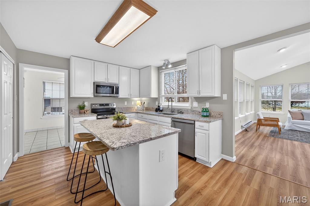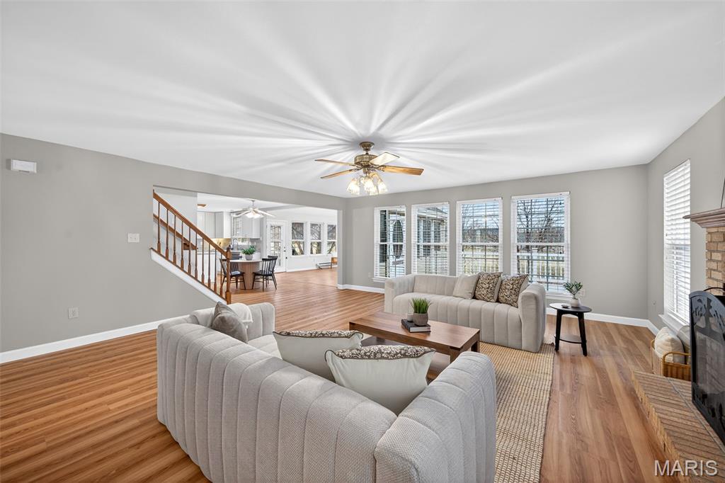 Welcome to this beautiful & spacious 4-bedroom, 3.5-bath home offering comfort, elegance & incredible views in a highly desirable golf course community. The thoughtfully designed main level features a separate dining room for gatherings and a versatile sitting room—ideal for a home office or quiet retreat. Main-floor laundry and a powder room add convenience. The heart of the home is the expansive great room w/a cozy fireplace and stunning views of the 5th fairway and tranquil pond. From here, step out onto the deck w/a covered retractable awning—perfect for relaxing or entertaining. The sunroom showcases panoramic views year-round, creating the perfect spot for morning coffee or evening unwinding. The kitchen shines with granite countertops, pantry, updated cabinetry, center island w/breakfast bar & stainless steel appliances. Upstairs, the spacious primary suite includes a luxurious bath and walk-in closet. Three additional bedrooms, a full bath & a generous loft offer flexible living space. The finished lower level is designed for entertaining & extended living, offering a family room with fireplace, large rec room with walkout to the covered patio, full kitchen & two additional finished rooms - ideal for quests, fitness, crafts or media space. Outside enjoy beautiful landscaping, fenced backyard, mature trees & scenic views in every season. Residents of this wonderful community enjoy access to a clubhouse, pool, playground, tennis & basketball court. The Beautiful Falls Golf Course—open to the public for even more recreational opportunities. Perfectly located & filled with exceptional features, this home is truly a special place to create lasting memories.
