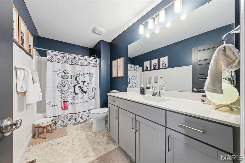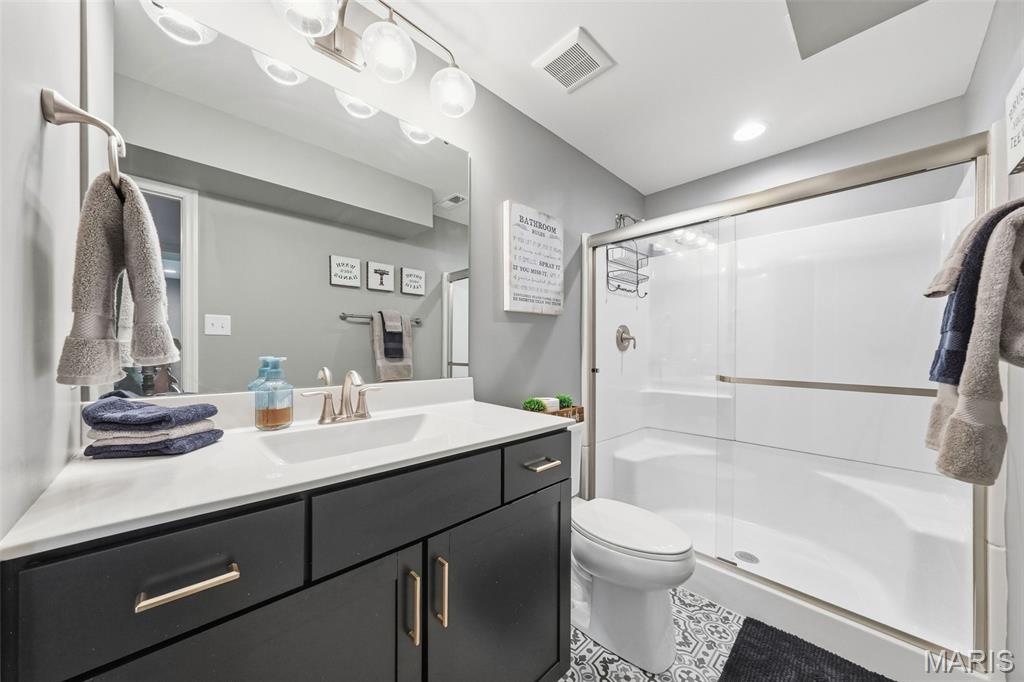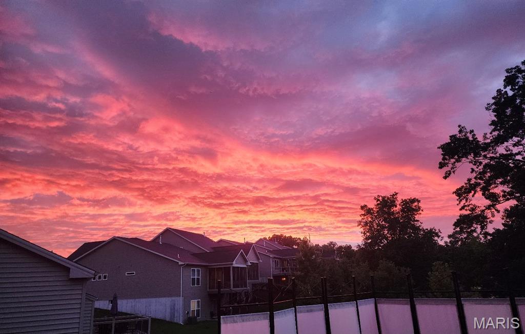 Professional photography coming 3/27. Welcome to this former display home by Fischer & Frichtel, thoughtfully elevated with high-end upgrades throughout. From the moment you step inside, you’re greeted by a stunning flex space—currently used as a home office—featuring custom built-in cabinetry, quartz countertops, and an impressive 8-foot double bypass barn door system. The entry flows seamlessly into the inviting family room, complete with a striking accent wall, cozy fireplace, and recessed lighting. The open-concept layout continues into the dining area and beautifully appointed kitchen, showcasing a center island with cultured marble countertops, 42-inch cabinetry with crown molding, glass tile backsplash, and stainless steel appliances. The main level also includes a walk-in pantry, laundry room, and convenient half bath. Step outside through the impressive 8-foot sliding door onto the composite deck—perfect for entertaining or relaxing. Automated zebra blinds throughout the main floor provide the ideal balance of natural light and privacy. Upstairs, you’ll find a spacious bonus room, three generously sized bedrooms, and two full baths. The hall bath features stylish shiplap wainscoting. The primary suite is truly a showstopper, boasting an elegant millwork accent wall paired with a custom tree mural. The luxurious primary bath offers a soaking tub, separate shower, relaxing private water closet, and a large walk-in closet. The finished lower level expands your living space with a rec area, additional family room, full bedroom, and full bathroom—ideal for guests or multi-generational living. Enjoy peaceful evenings on the charming front porch or take in breathtaking sunset views from the back deck. The fully fenced backyard is an entertainer’s dream, featuring a stamped concrete patio, a nearly new hot tub with built-in speakers and lighting, with added privacy elements from a Sunsetter awning for shade and comfort. The home has a partial tree view just beyond the large common ground area to the rear. This home has been meticulously upgraded and truly stands out—offering the perfect blend of style, function, and luxury.