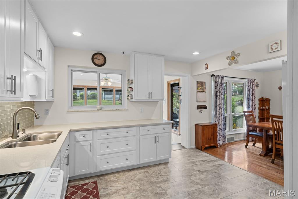 Opening Day ‘26 may have come and gone, but 5100 Caribee is still battin’ a thousand. This isn’t Big Mac Land… but it’s pretty darn close. This 1960s split-level in Mehlville brings 3 beds, 3 baths, and over 2,000 sqft on nearly *half* an acre. Strong curb appeal right out of the gate with a large driveway and classic exterior that holds its own. Step inside and you’re greeted with hardwoods and a split foyer that lets you call the play, up or down. Upstairs, the living room is bright and open with large double-hung windows that keep things light all day long. It flows right into this dining room, ready for dinners, holidays, or whatever you’re hosting next. The kitchen has been renovated with white cabinetry, quartz countertops + a glass backsplash that actually makes you stop and look. There’s even a peek-through window into the bonus room, which might steal the show. New flooring, built-ins + windows everywhere make it perfect for a playroom, office, gym or extra hangout space. Three spacious bedrooms sit on the main level, including a primary suite with a full en-suite that brings the pink tile and a walk-in shower that just works. The hall bath leans into the butter yellow charm in the best way. Downstairs, the lower level is your cozy go-to with built-in bookshelves, plenty of storage + the MVP… a gas fireplace with unlacquered brass details. Feels like the perfect spot to catch a game or settle in for the night. There’s also another full bath down here, which is a rare win. Laundry is tucked away and ready for whatever setup you want next. Out back, you’ve got a walkout patio, and a fenced in yard that keeps going in the back & on the side! Corner lot, tons of green space + room to do entertain like you’re in those all-you-can-eat seats at Busch, no one telling you to slow down. Quiet neighborhood, great neighbors, easy access in n out + close to all the local staples, like Liliana’s Italian Kitchen, Bartolino’s South, Trattoria Toscaso, Salt + Smoke, and so many more. Bonus? Brand new roof in 2025! This one plays the full nine. Cheers!