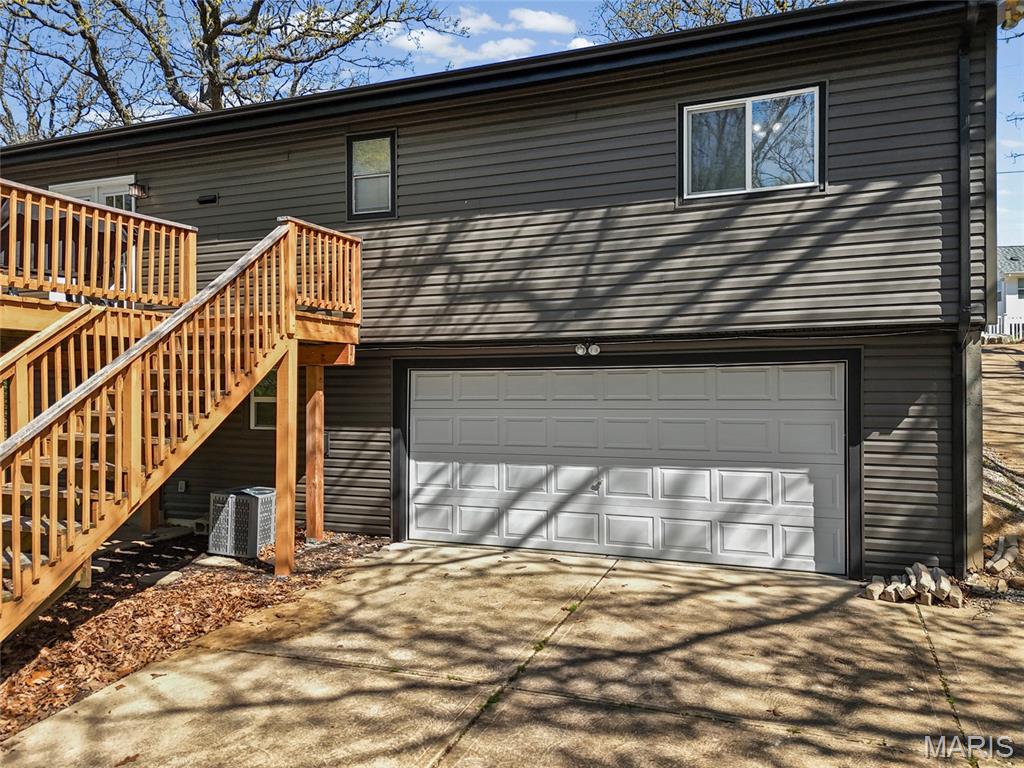 Welcome to this beautifully updated home nestled on a quiet street in Arnold! Featuring luxury vinyl plank flooring throughout and a spacious living room, this home offers both comfort and style. The kitchen is equipped with new appliances, ample cabinet space, and a pantry for added storage. A stunning vaulted ceiling with exposed beam creates a striking focal point and enhances the open feel of the main living area. Step outside to the large deck overlooking a private backyard, perfect for relaxing or entertaining. The finished lower level includes a second living area with a cozy fireplace, a bonus/storage room, half bath, and walk-out access to the patio and yard. The oversized two-car tuck-under garage provides convenience, while the long driveway and additional street parking offer plenty of space for guests. Major updates include NEW windows, appliances, and flooring (2024), plus NEW impact-resistant roof, siding, gutters, shutters, and soffits (2025). All appliances stay—move right in and enjoy! Occupancy is complete, and the seller will provide a passed septic inspection for your peace of mind.