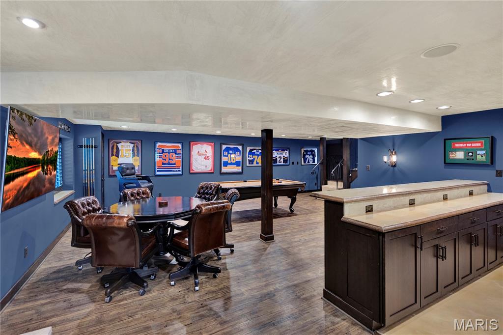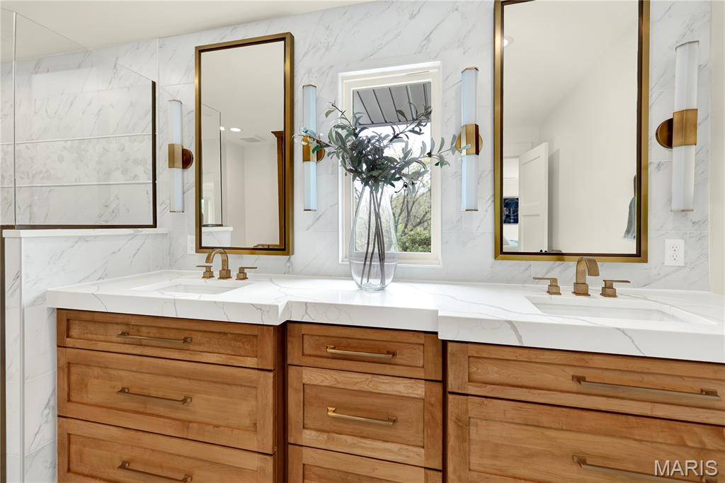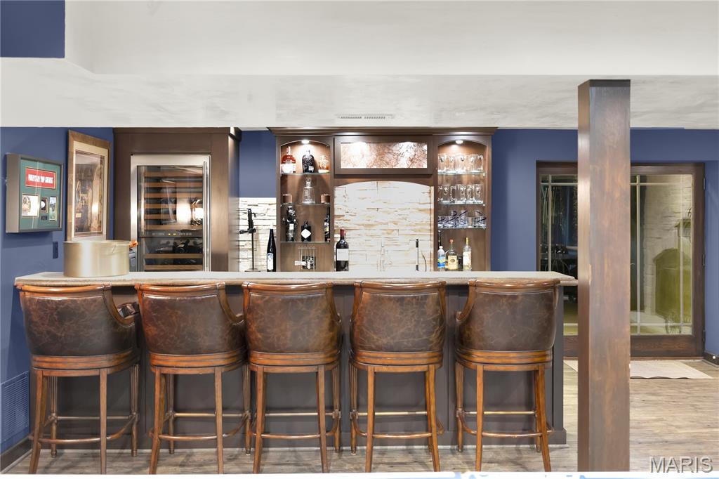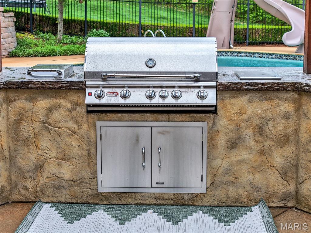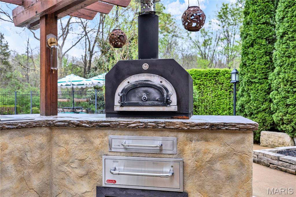 Nestled at the end of a quiet cul-de-sac and backing to completely private woods, this spectacular Contemporary Craftsman has been renovated from top to bottom with zero compromises. Every inch has been touched, every and every space reimagined — delivering the feel of new construction with the warmth of an established neighborhood. The main floor was opened up to create seamless living and dining spaces, anchored by re-sanded hardwood floors, a new fireplace, and a fully outfitted living room bar with sink, dishwasher, double beverage drawer, and ice maker. The chef's kitchen features a Thermador gas range and oven, Thermador dishwasher, built-in microwave, ice maker, and a butler's pantry with a KitchenAid second oven and warming drawer. New Hardie board siding, a new roof, all-new Pella windows with custom casing, new K-style gutters with square downspouts, new automatic shades, new iron front door, new garage doors, and completely redesigned mature landscaping with lighting complete a stunning first impression. Upstairs, the primary suite was completely gutted and rebuilt — featuring a spa-caliber bathroom and custom floor-to-ceiling built-ins throughout the bedroom and closet. A second HVAC unit serves the upper level, and a fully remodeled second bathroom and new luxury vinyl tile flooring round out the floor. The finished walkout lower level is an entertainer's dream — stepping directly out to the pool. A full bar with Sub-Zero-caliber refrigerator, ice maker, drawer dishwasher, and microwave anchors the space alongside a fireplace, movie room, additional bedroom, and a full bathroom with steam shower. The seamless indoor-outdoor flow makes this level the ultimate warm-weather entertaining hub. Outside, a resort-style backyard backs to private woods with a stunning pool featuring all-new tile, coping, equipment, and heater. A fully equipped outdoor kitchen and bar — complete with new cabinetry, beverage drawer refrigerator, sink, built-in cooler, Bull barbecue pit on a dedicated gas line, pizza oven, warming drawer, Bull refrigerator, and large gas fire pit — create an outdoor entertaining environment that is truly second to none. A finished and heated garage with epoxy flooring, whole-home Sonos system indoors and out, and professionally landscaped grounds with architectural lighting complete a home that is truly without equal in Town & Country.